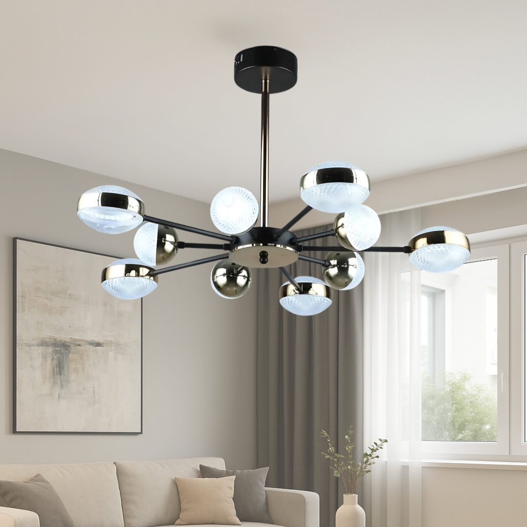 Сучасна стельова люстра на 10 плафонів забезпечує рівномірне, м’яке світло без тіней — зручно працювати, читати, займатися хобі чи зустрічати гостей.